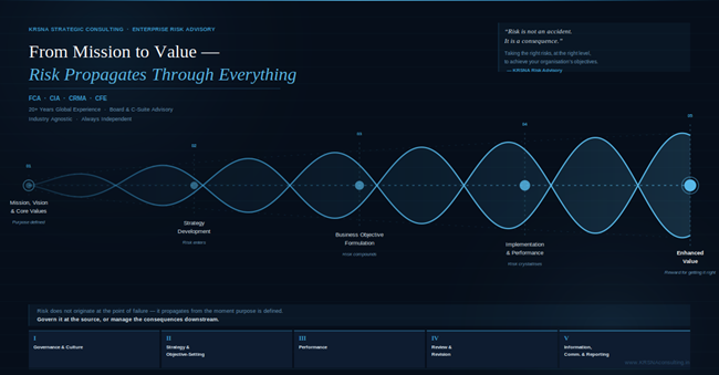 At KRSNA Strategic Consulting, we have always operated at the intersection of bold ambition and rigorous thinking — growth strategy, data-driven decisions, commercial excellence. We now bring that same executive lens to Risk Advisory — because sustainable growth and intelligent risk-taking are not separate conversations. They are the same one.